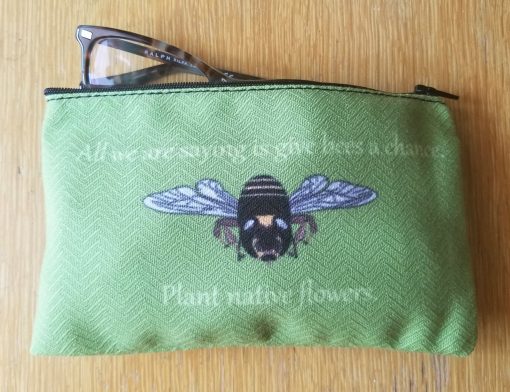 This is the Green Bee, zippy pouch is approximately 6.75″ x 3.75″ but sizes may vary up or down slightly due to the fact we are using scrap fabrics. The fabrics we print on are made from recycled plastic bottles. We may also occasionally use other scrap fabrics that were headed for the waste stream. It is our goal to reuse as much existing textiles as possible. Over 85% of textiles end up in the landfills.